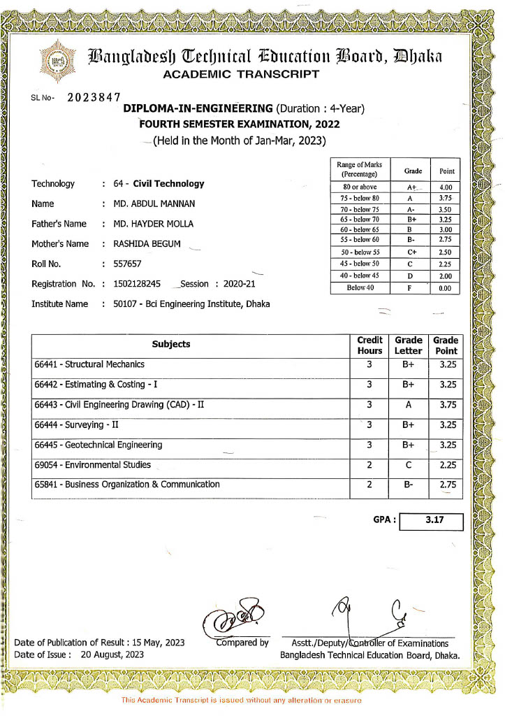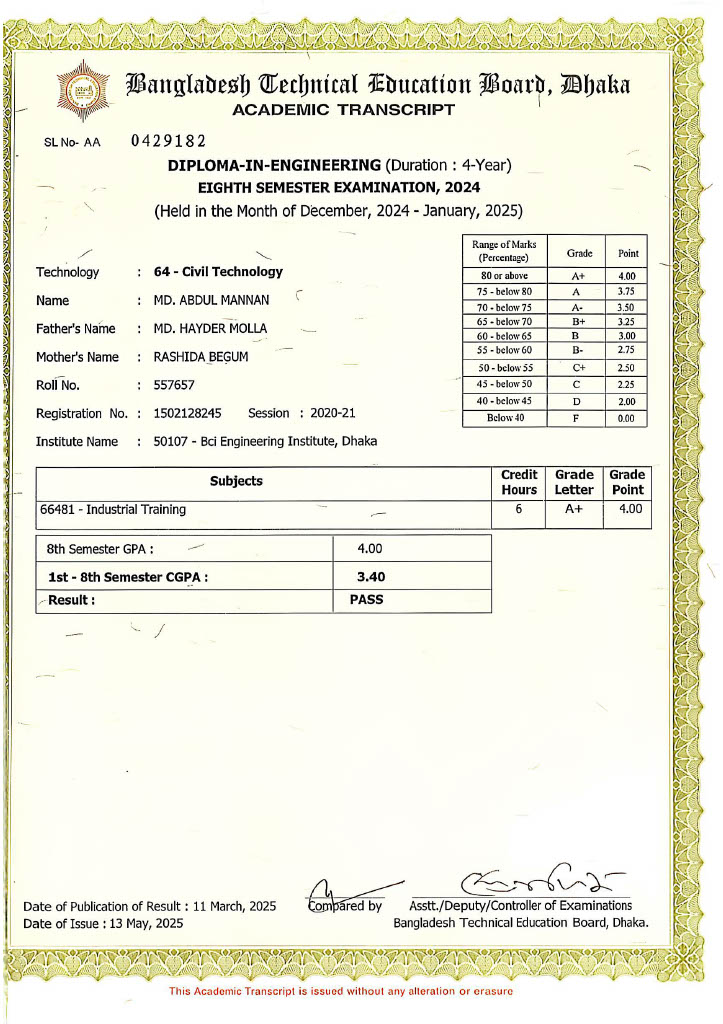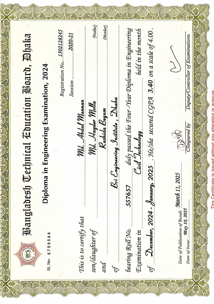 Md. Abdul Mannan is a Diploma Civil Engineer with hands-on experience in building construction, RCC structural works, AutoCAD drafting, BBS & BOQ preparation, and on-site supervision. He has developed strong technical skills in interpreting structural drawings, quantity take-off, material estimation, and maintaining quality control throughout construction projects.